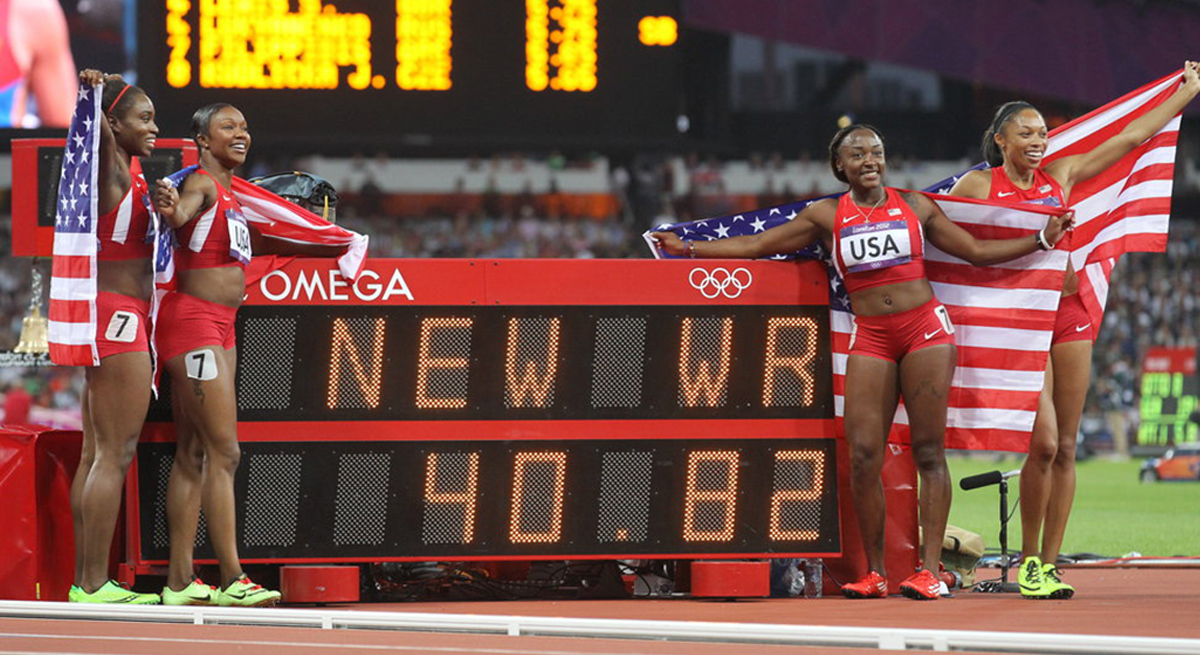 Relive a world record performance at the 2012 London Olympics by the U.S. Women's 4x100 Relay Team. The team of Tianna Madison, Allyson Felix, Bianca Knight (3rd leg), and Carmelita Jeter ran 40.82, shattering the previous world record of 41.37, which had been held by East Germany since 1985.
